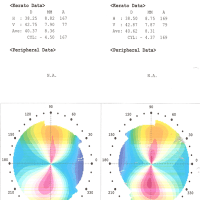 - טופוגראפיה של שטח הקרנית (שבה המחשב מקרין תמונה של placido disc שהן טבעות עגולות לקרנית והמחשב מנתח את תמונת הטבעות המוחזרת מהעין ונותן מדידה של קימור הקרנית בכל נקודה על השטח שלה